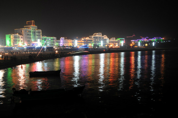 很早就游玩了九丈崖,我們決定回漁家休息,今天的行程暫告段落。晚上飯后,又到明珠廣場(chǎng)看夜景,一輪彎月掛在海的上空,周圍燈火通明,游樂(lè)場(chǎng)里也熱鬧非凡,帶著孩子們?cè)谟螛?lè)場(chǎng)玩,我則和姐姐她們拍照片玩,一直拍到晚上快10點(diǎn)鐘才結(jié)束。住的漁家門前是馬路,馬路這邊就是海,坐在長(zhǎng)廊下,可以靜靜的看太陽(yáng)下山和碼頭那邊來(lái)往的船只。