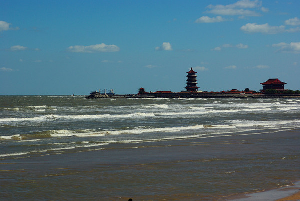 當天的海風好大,船都不能出海了,原本計劃直奔長島的出海計劃也因此擱置了,就在蓬萊閣邊上的海邊先走走吧,看看風浪有多大。這個是八仙過海那個景觀吧,亦或是三仙山?忘記了。。。哈哈哈