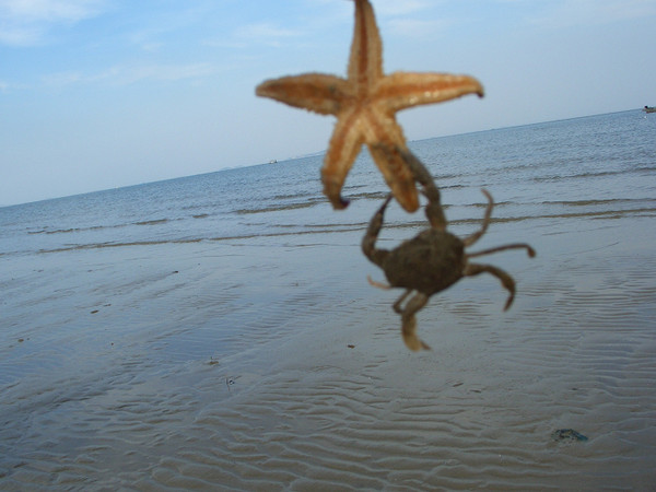 發(fā)現(xiàn)一只活的小螃蟹,用海星逗它,這小東西哈挺厲害~抓住人家就不放了。