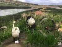 圖為黃河三角洲濕地展區(qū),赤麻鴨、赤膀鴨等雁鴨類悠閑地伸展翅膀?!O婷婷 攝 “濕地精靈——山東鳥類標本展”18日在山東博物館正式開展,金雕、丹頂鶴、鴛鴦等