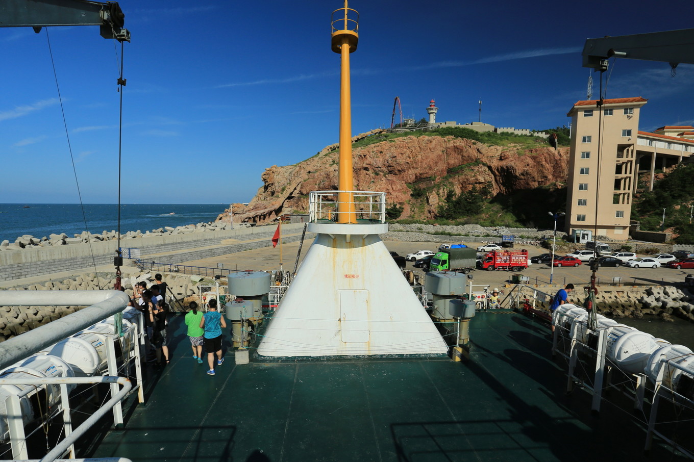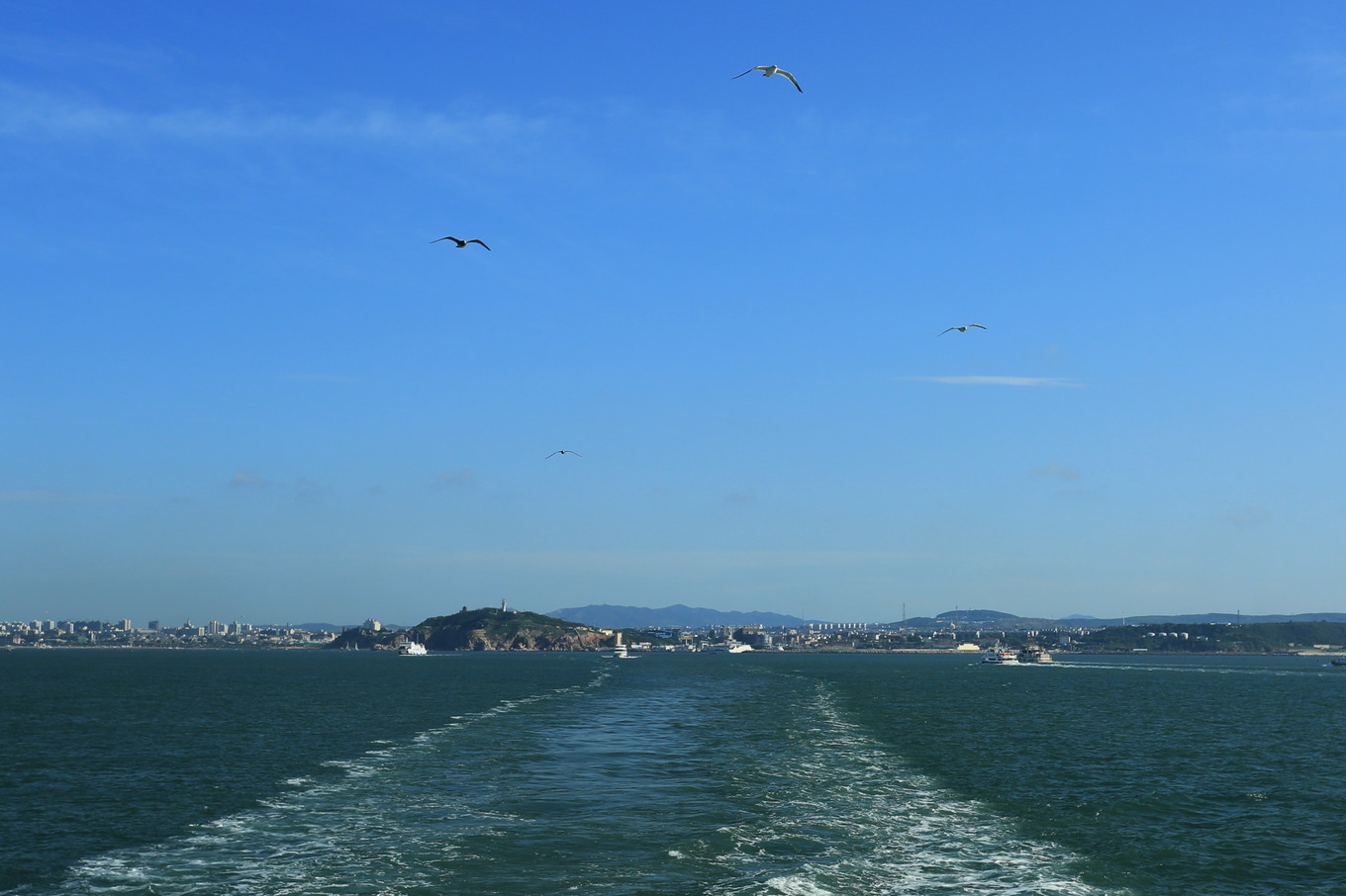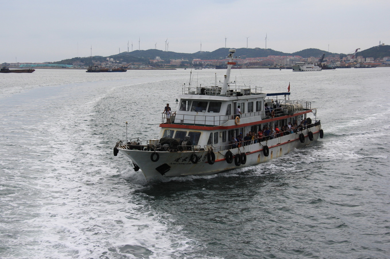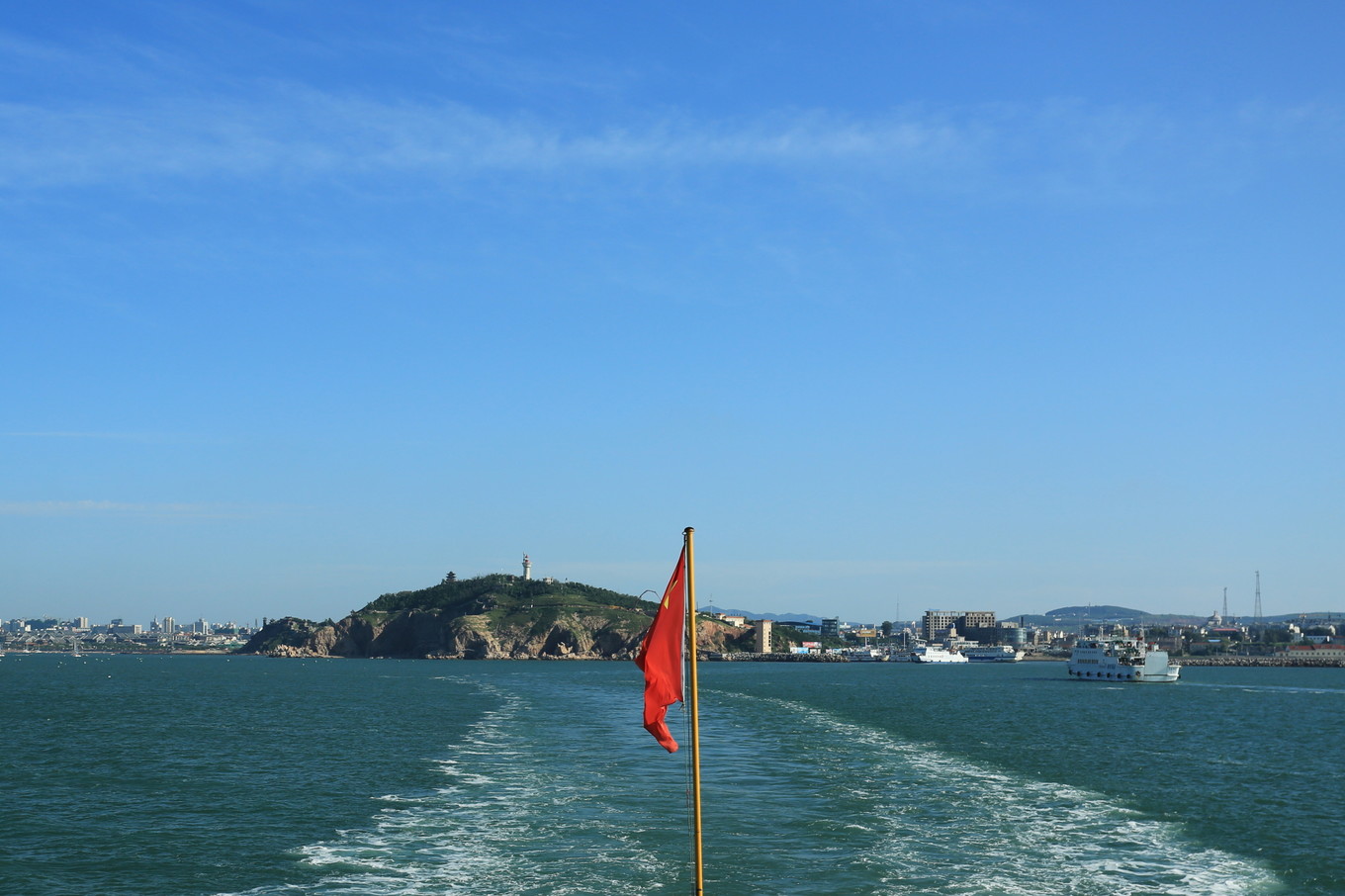 沒(méi)有記錄開(kāi)船的時(shí)間,大概是14:00左右開(kāi)的船,似乎比船票的時(shí)間晚了一二十分鐘吧,已經(jīng)離開(kāi)了蓬萊,遠(yuǎn)處是碼頭邊的田橫山