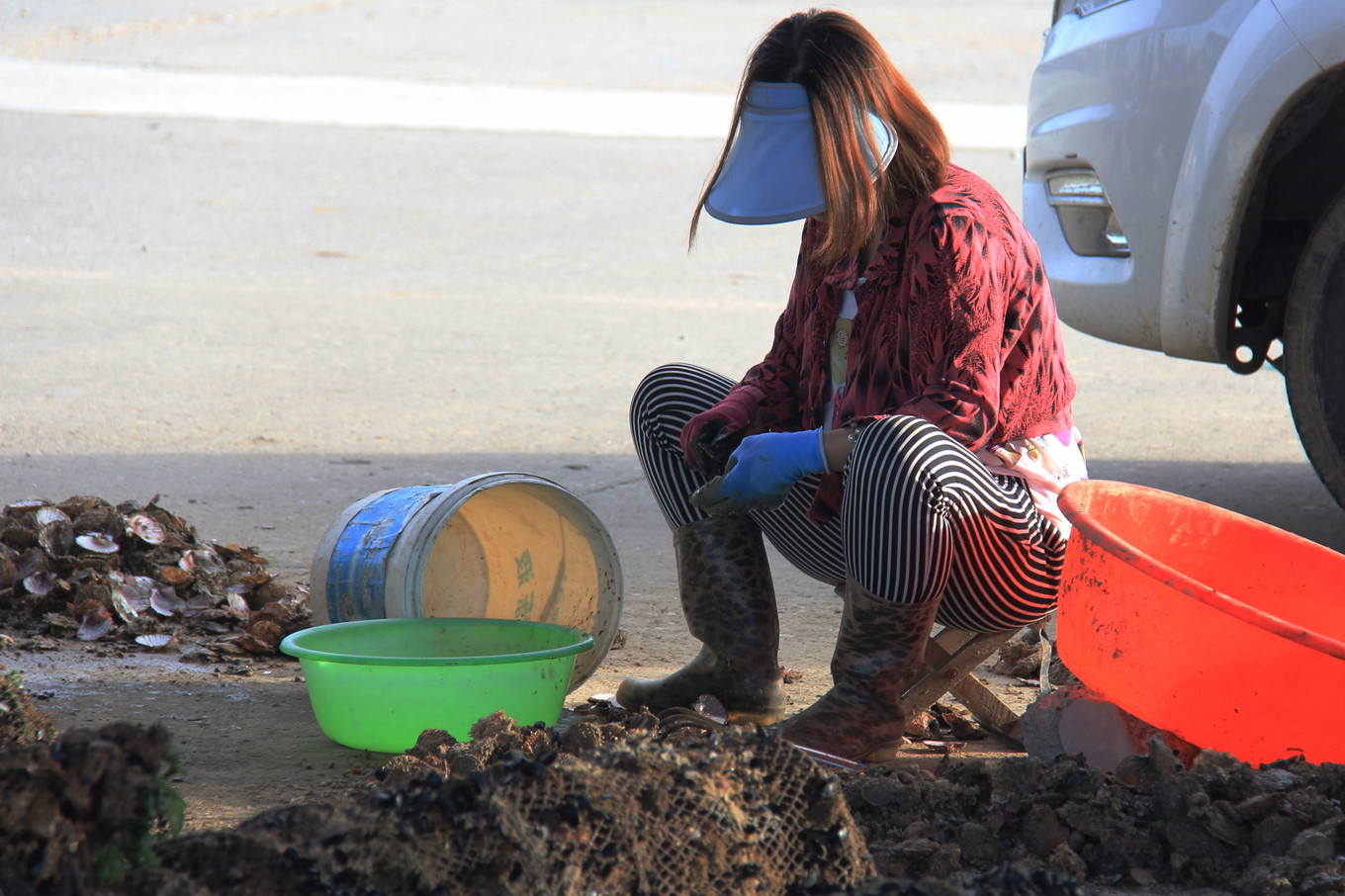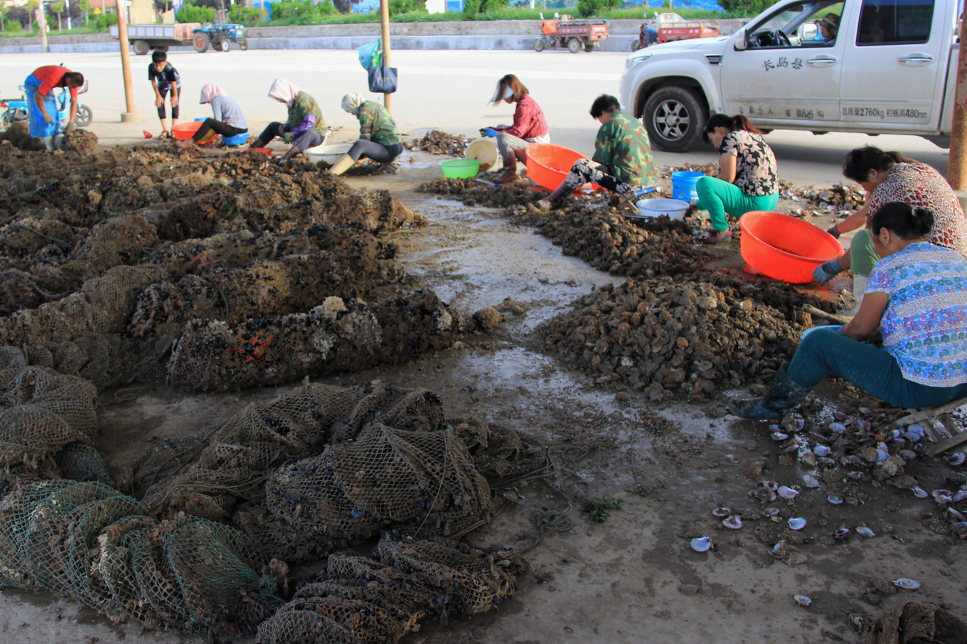 從橋北頭到碼頭也就5、6百米的距離,碼頭上可以停車(chē),我們就在這里看漁家卸下養(yǎng)殖的扇貝并初步處理