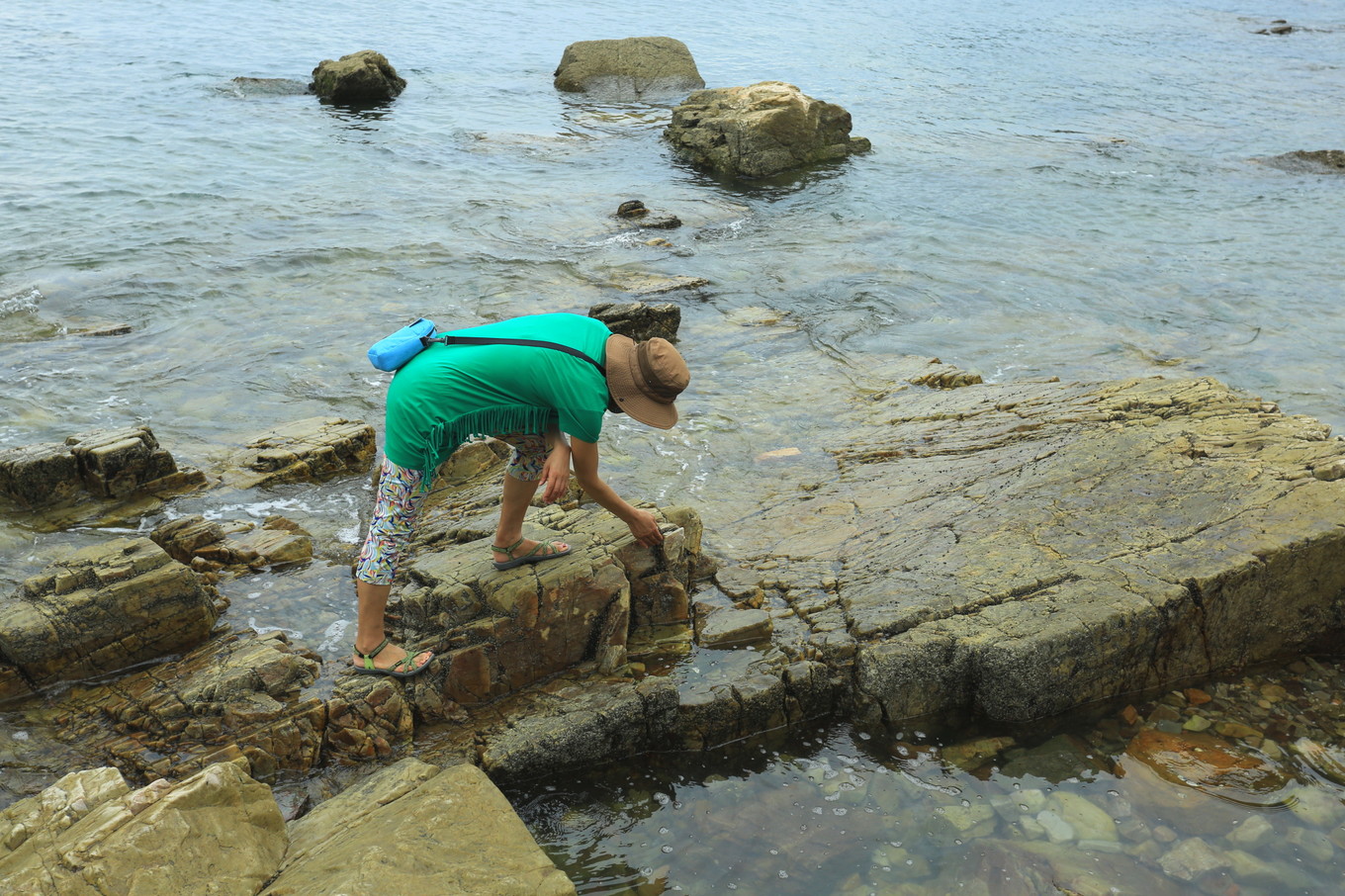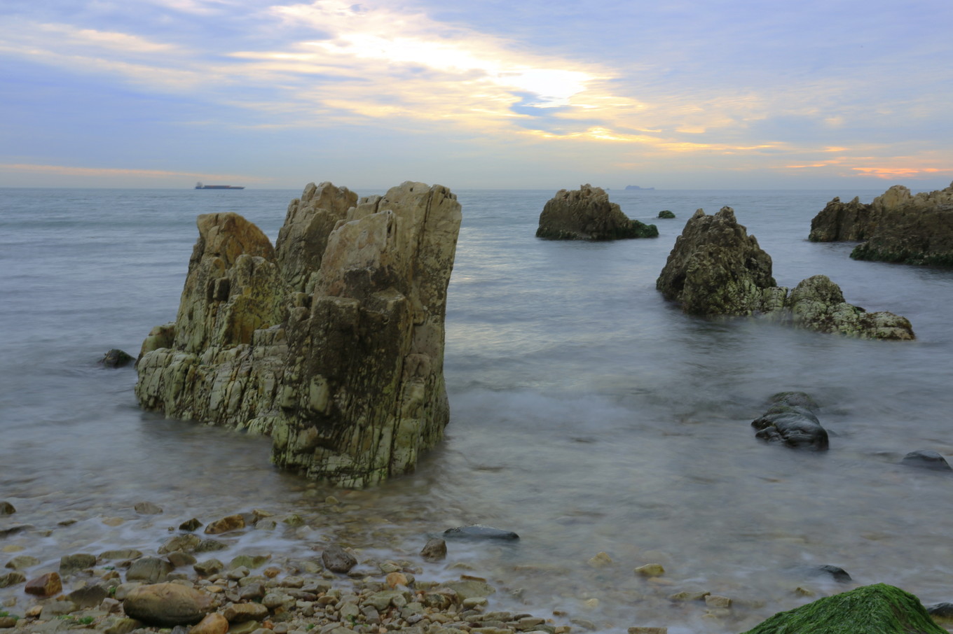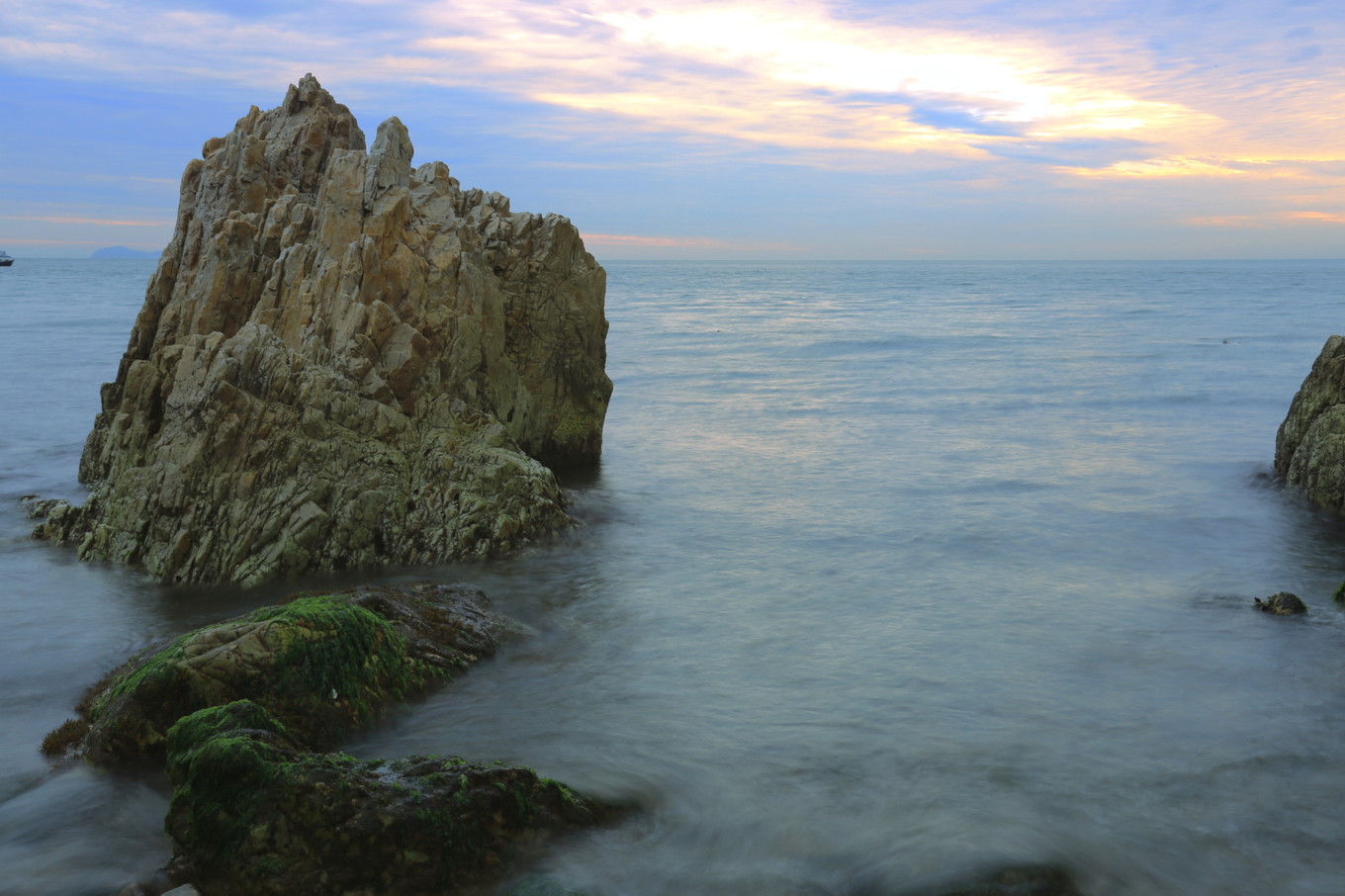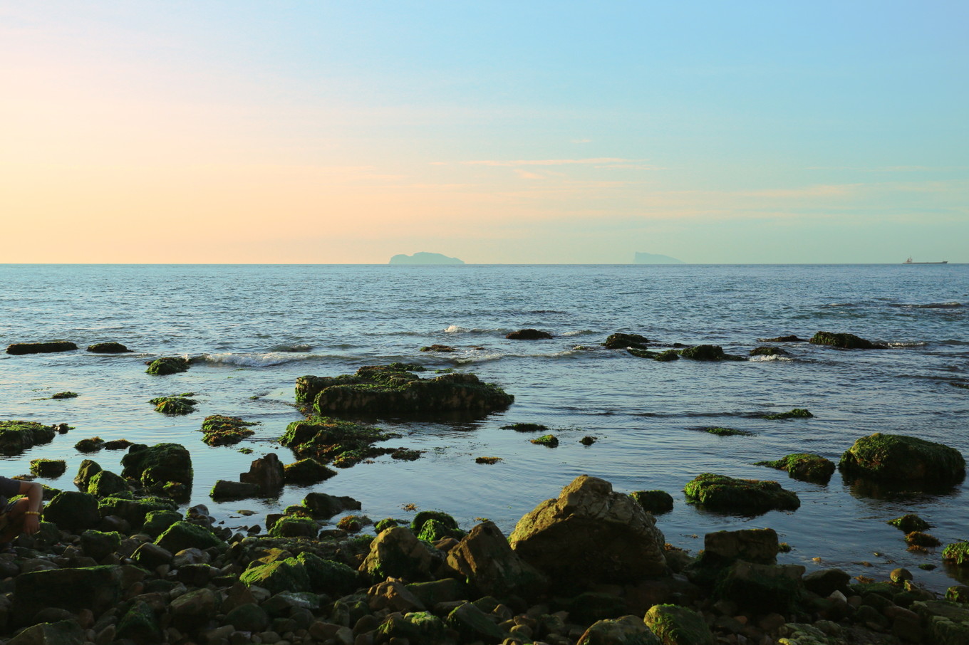 沒(méi)有看到日出,從山上向東下到海邊的奇石灘,這里看日出也是不錯(cuò)的地方,清晨的人不多,海灘邊散落著大小不一的礁石,海浪不算很大,坐在岸邊可以靜靜的傾聽(tīng)到海浪沖刷在礁石上的嘩嘩聲