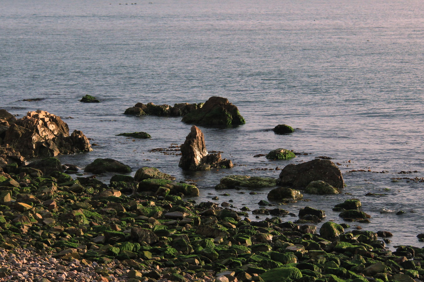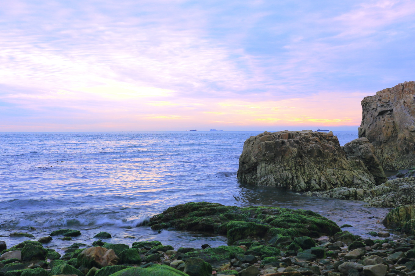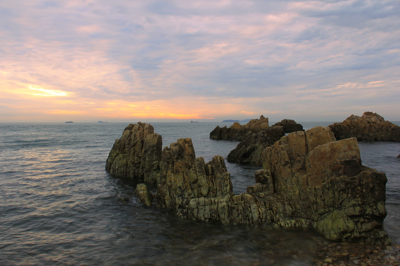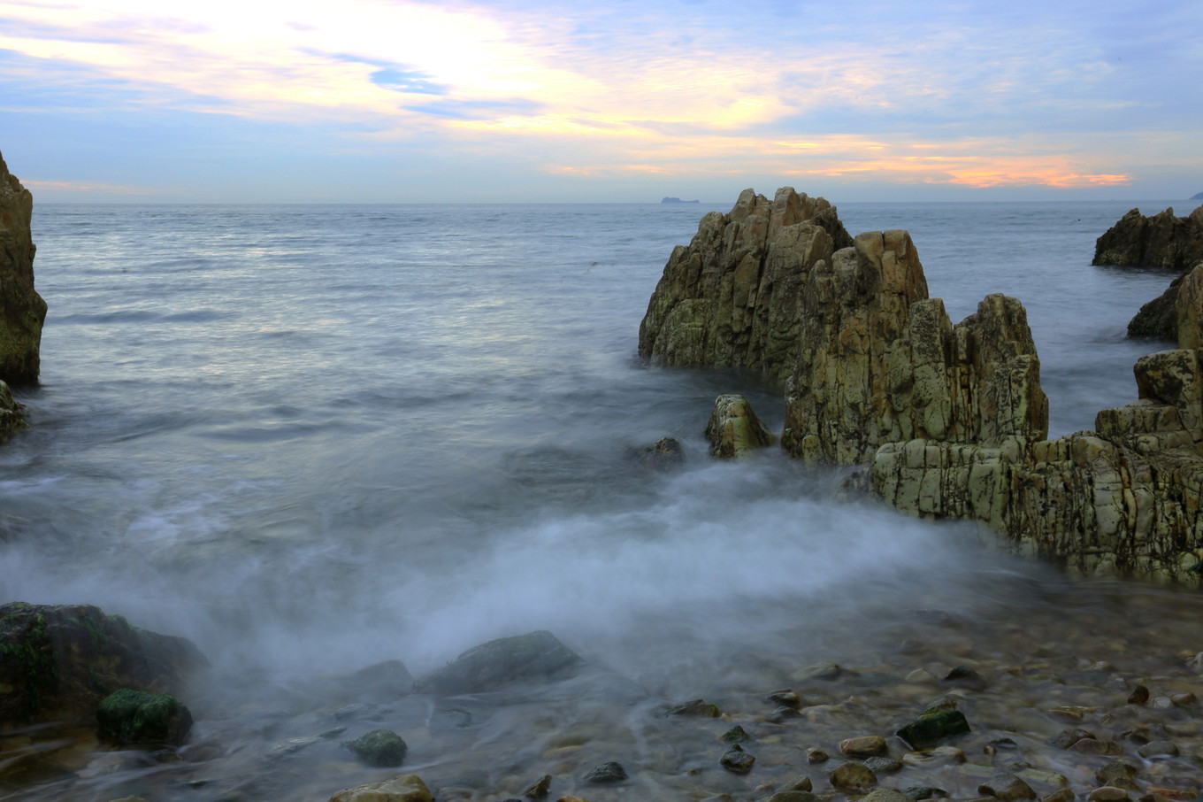 沒(méi)有看到日出,從山上向東下到海邊的奇石灘,這里看日出也是不錯(cuò)的地方,清晨的人不多,海灘邊散落著大小不一的礁石,海浪不算很大,坐在岸邊可以靜靜的傾聽(tīng)到海浪沖刷在礁石上的嘩嘩聲