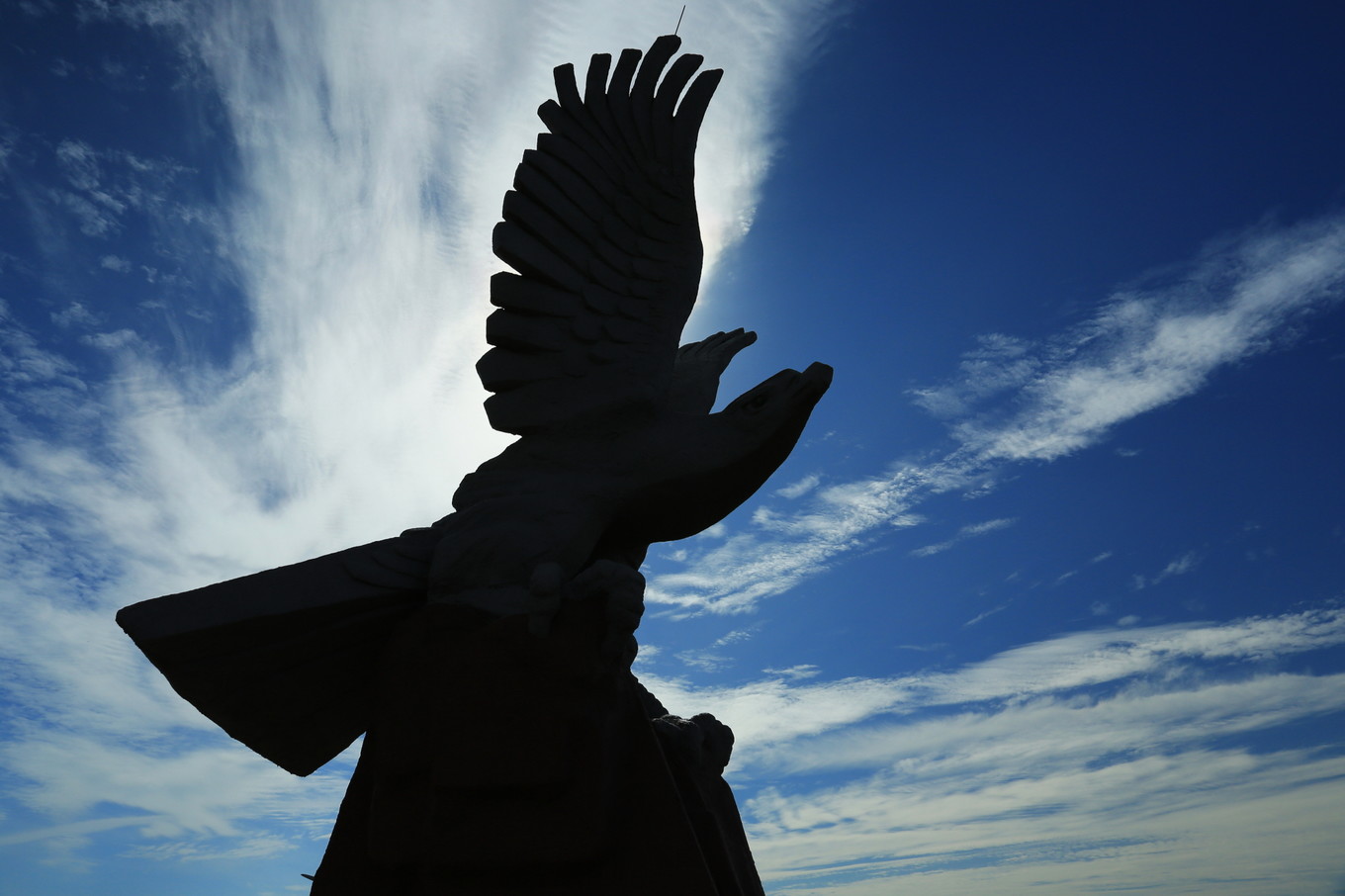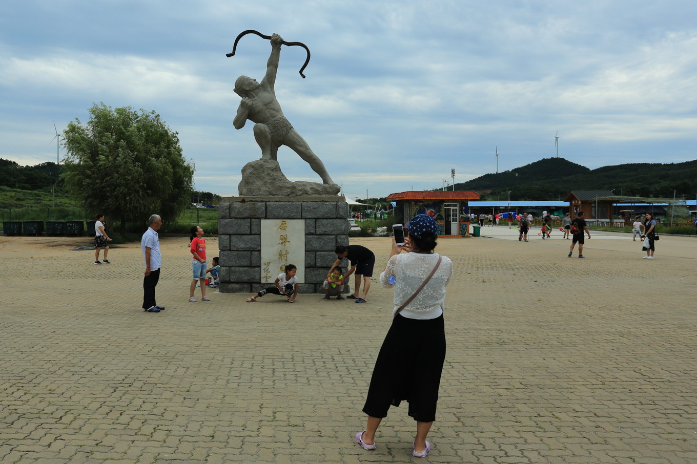 我們進(jìn)入月牙灣已經(jīng)是上午九點(diǎn)多了,天空一直都是陰的,進(jìn)門(mén)后是一片空曠的廣場(chǎng),廣場(chǎng)上有后羿射日的雕像