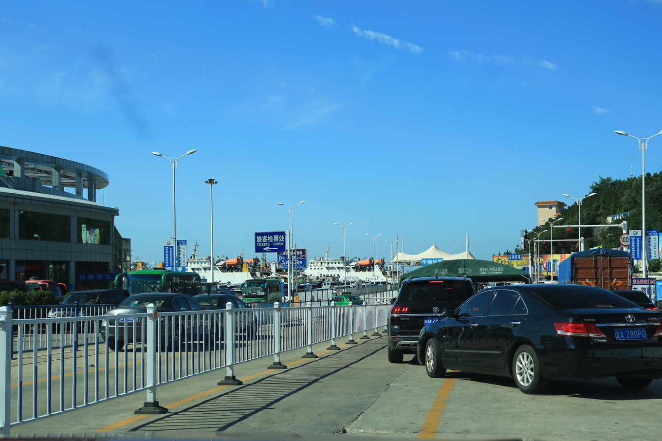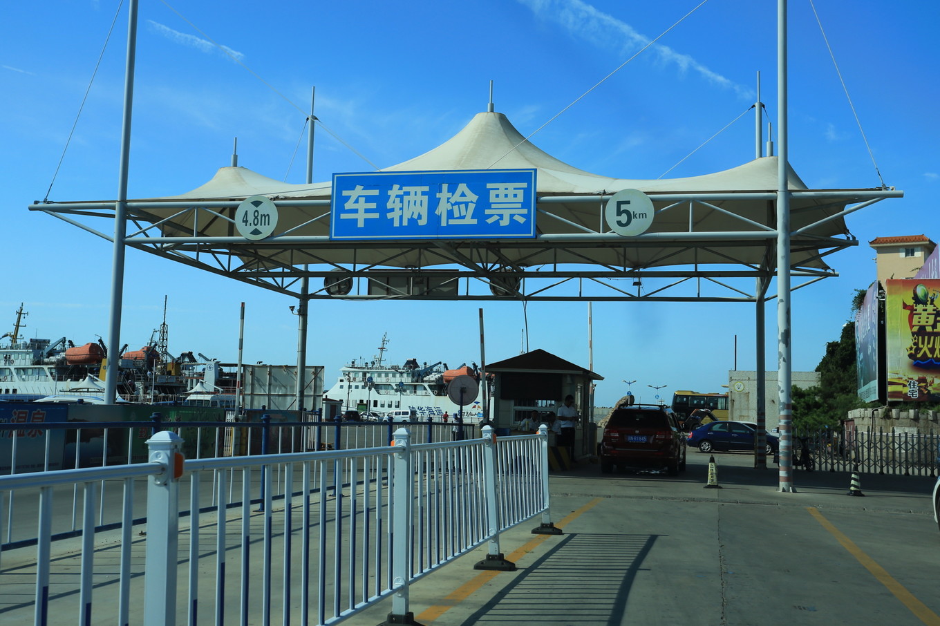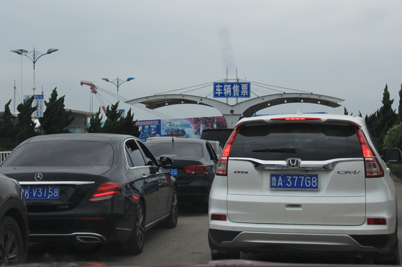 15:01到達(dá)蓬萊港(去長(zhǎng)島就是在蓬萊海洋極地世界北邊的碼頭),暑假快要過(guò)去了,下午上島的車(chē)也不是很多了,自駕車(chē)和車(chē)上的乘客都在這里從車(chē)上排隊(duì)即可,前方的綠色棚子是安檢,經(jīng)過(guò)安檢,會(huì)給一張安檢條,上面有乘客人數(shù),憑借此條到前方右側(cè)售票處購(gòu)買(mǎi)車(chē)和乘客的船票,買(mǎi)票需要身份證實(shí)名制,兒童半票,司機(jī)也需要購(gòu)票