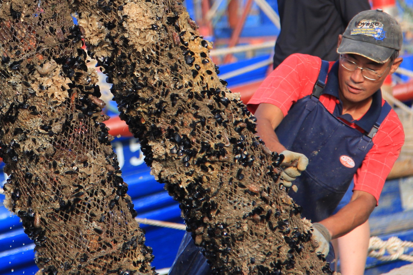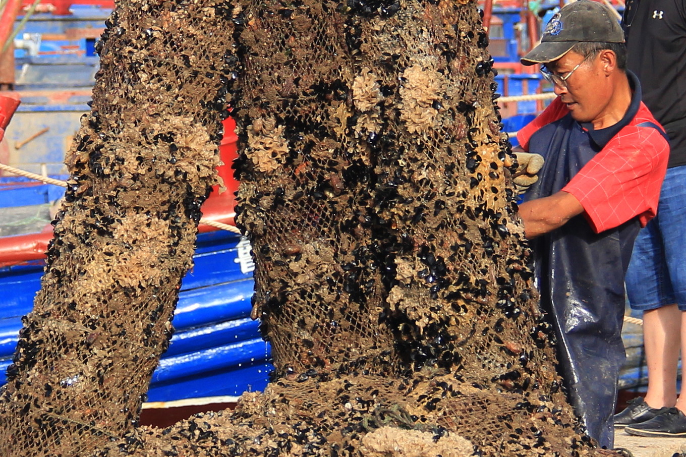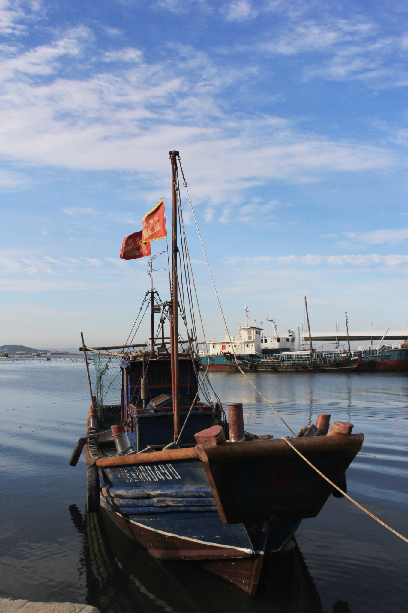 在碼頭上只有一只小船卸下養(yǎng)殖的扇貝和做簡(jiǎn)單的處理工作
