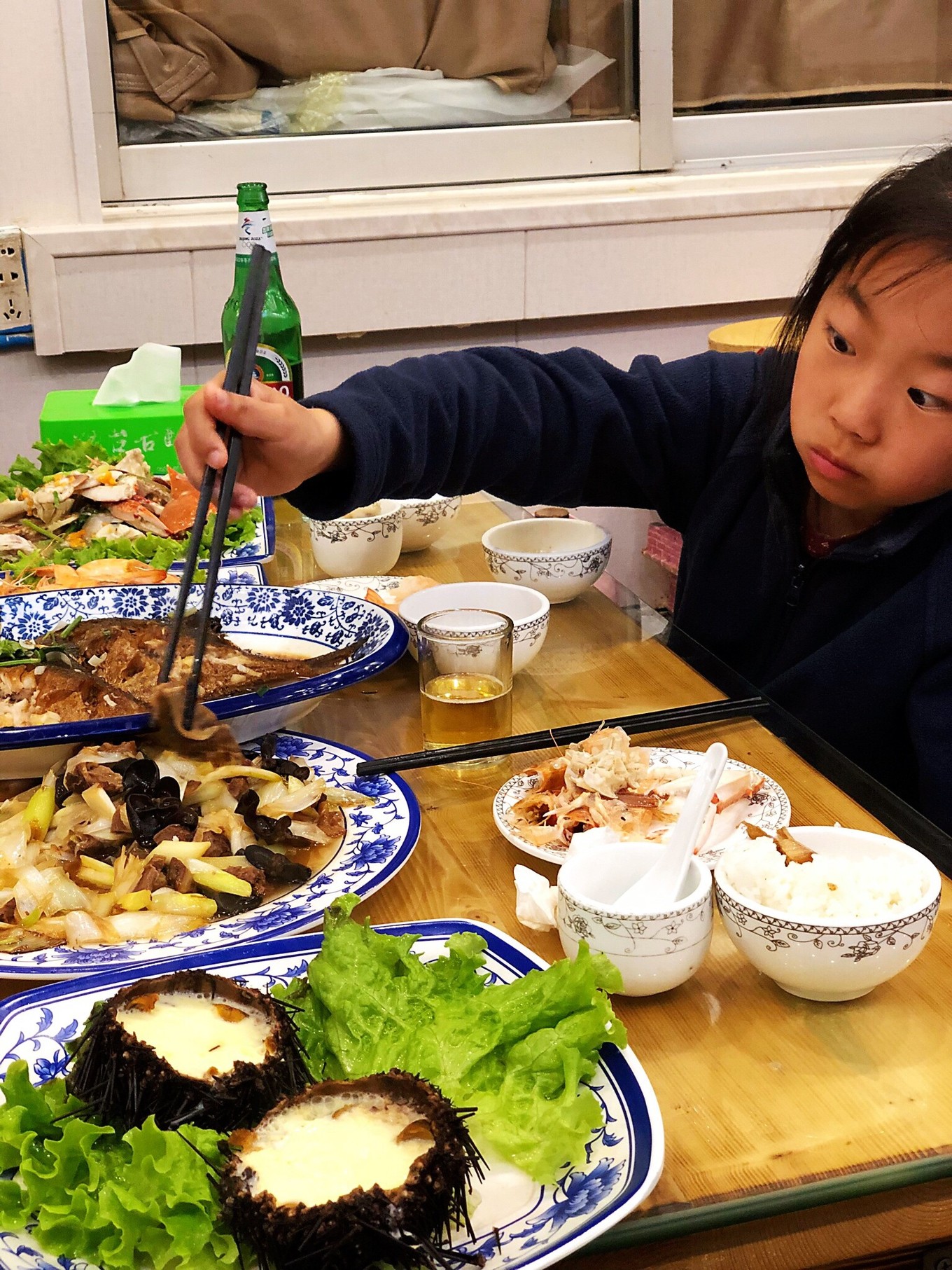我們家?guī)讉€(gè)人并不怎么能吃海鮮,基本就點(diǎn)了條魚,幾只蝦蟹這樣。對(duì)了,海膽燉蛋是長島的保留菜式,總要嘗一嘗。不過這海膽的成色嘛,一般般。