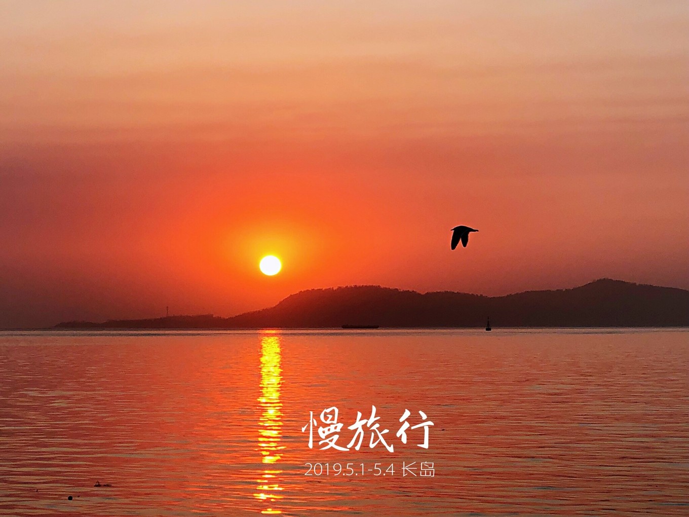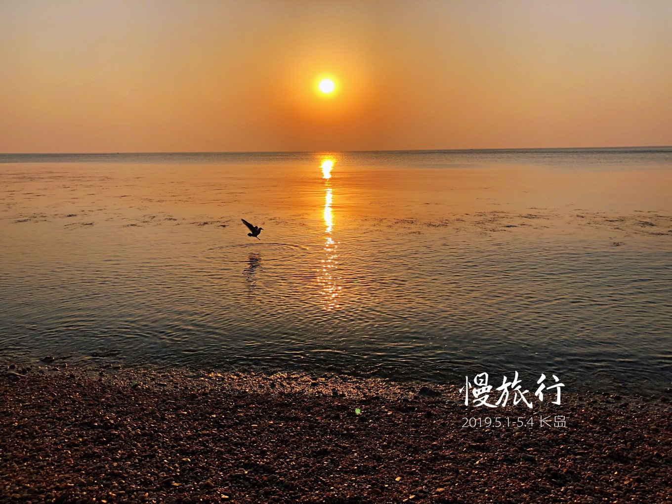 一只海鳥飛進(jìn)畫面,慢悠悠,翅膀扇得好像要停下來似的。估計(jì)是他也感受到了這落日的溫馨,也在享受這片刻的愜意吧。