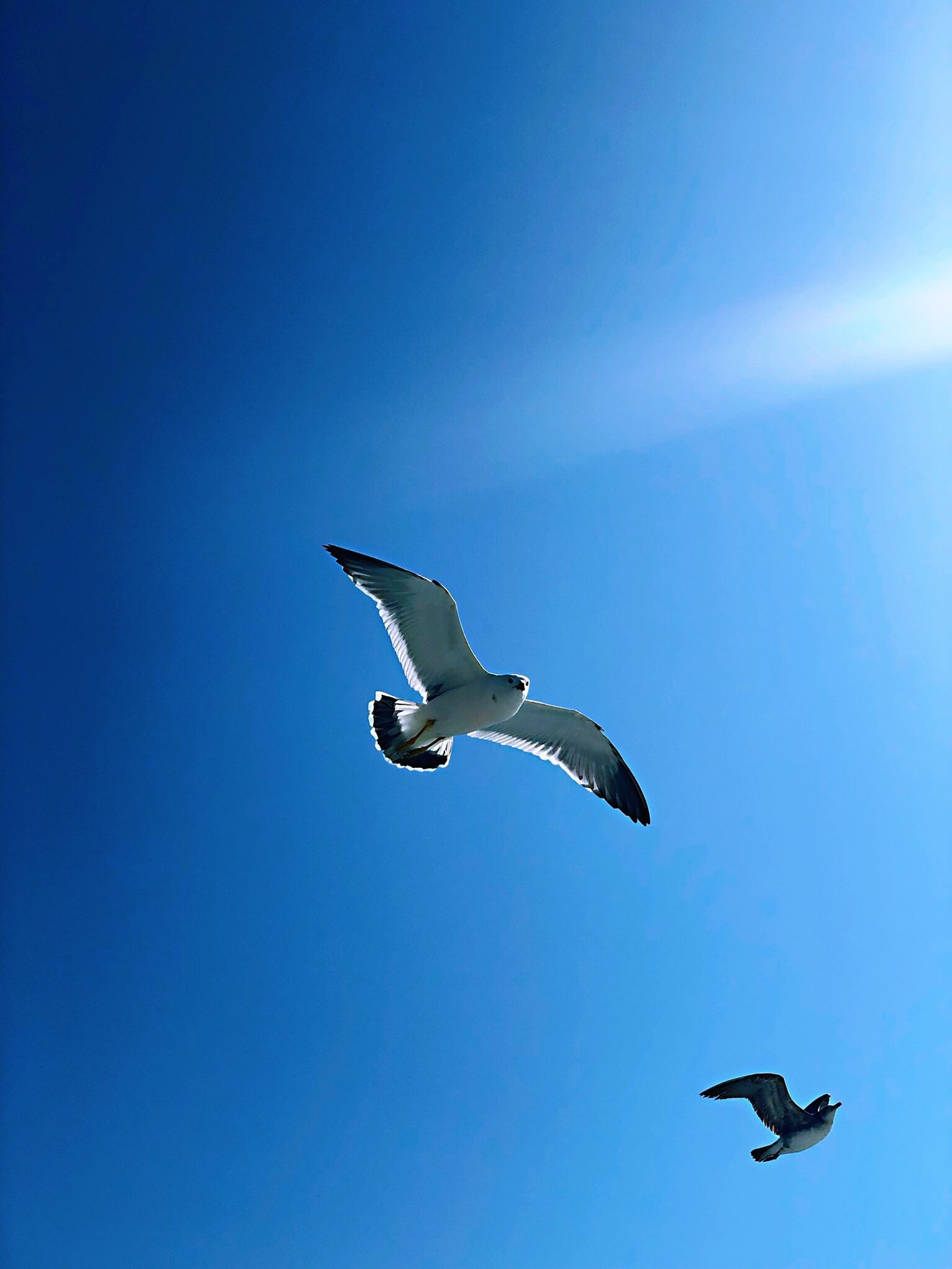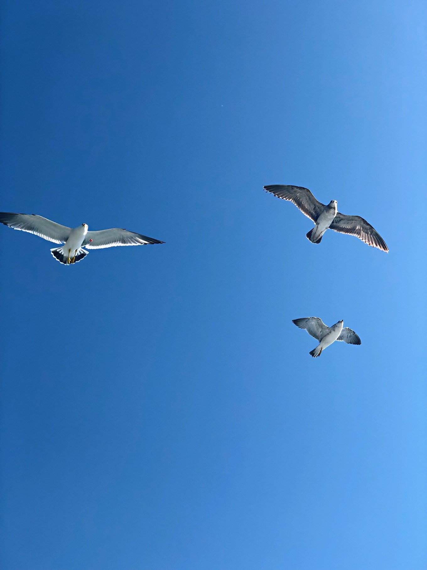 這是我們的船在離他們最近的一段。船上的人們空前的亢奮,大都在船弦邊單手舉著食物,等著海鷗來吃。海鷗們更是對(duì)這一切駕輕就熟。這些敏捷的小家伙們,一面隨著船向著飛行,一面?zhèn)饶橁P(guān)注著船上的一切,神情專注得像鷹。有游客向上拋出食物,總會(huì)有眼疾膀快的海鷗迅速?zèng)_上去,穩(wěn)穩(wěn)接住。有時(shí)有兩只海鷗都瞄準(zhǔn)了一塊食物,輕輕一撞,便會(huì)有一只自覺沒戲,趕緊排到后面去,調(diào)整姿態(tài)等待下一個(gè)目標(biāo)。人們手里一些不會(huì)拋出的食物,照樣是海鷗們的囊中之物。人們又興奮又緊張地舉著半根不敢剩太短的火腿,有些怕被啄到,又不忍海鷗撲空而不敢把手收回。舉著舉著,BIU的一下手里就輕了。再看手里,火腿已經(jīng)齊根斷掉,速度之快,令人驚呼連連。