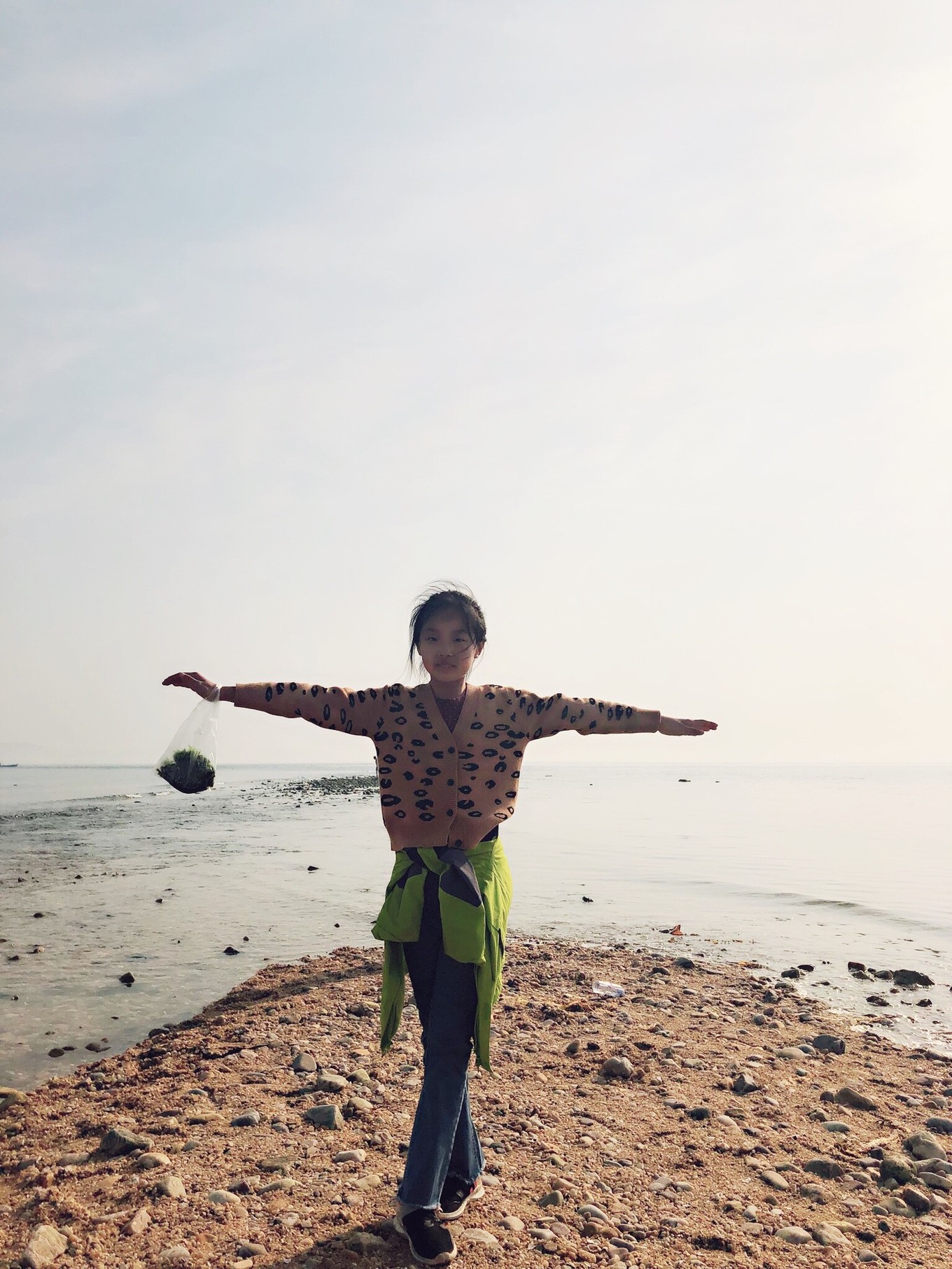 隨后就在這片沙灘上趕了趕海。也不知道為啥,也事先查了退潮時(shí)間,這沙灘上什么小蝦小蟹,連好看的貝殼都沒見到。最后只揀到了幾根海帶