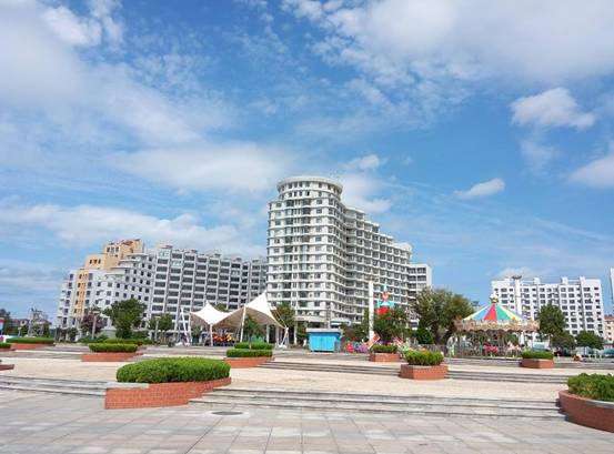 當(dāng)您面向北,海島特色的建筑群映入眼簾,紅色的屋頂、綠色的樹木與湛藍(lán)的天空、白色的云朵,相互映襯,是又一幅難得的五彩畫。