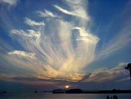 長(zhǎng)島的空氣特別好,藍(lán)藍(lán)的天空,經(jīng)常飄起朵朵云彩,白的如棉如雪,藍(lán)灰的似紗如綢,形態(tài)各異,相互追逐,變幻莫測(cè)。早晨有朝霞,傍晚有晚霞,在任何一個(gè)地方,您都會(huì)欣賞到美麗多姿的天空。