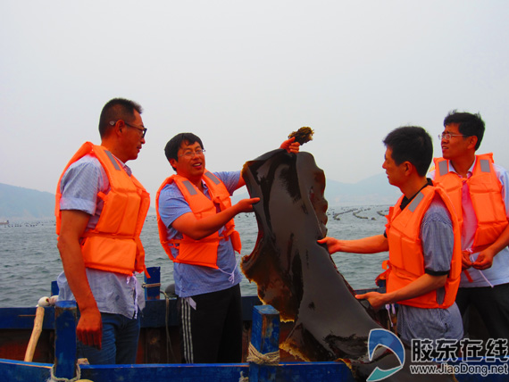 5月8日4點(diǎn),天微亮。李盛平早早來(lái)到位于南隍城村北的第十養(yǎng)殖場(chǎng)??吹揭卉嚱又卉噺暮@锸斋@的海帶,他心里充滿了喜悅:長(zhǎng)島旅游今年肯定是個(gè)豐收年?!案闪诉@么多年,打眼看看出水海帶的體量和厚度,就能目測(cè)出個(gè)大概。今年至少在一萬(wàn)噸以上?!笨吹截S收情景,李盛平一臉的興奮?!澳銈儊?lái)得巧?。〗裉焓俏覀儬C煮腌制海帶的開工日,這也標(biāo)志著南隍城進(jìn)入海帶的收成期?!?