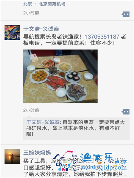滿懷興奮的心情坐上了駛往長島的船,終于踏上了長島的碼頭,第一件事兒,就是給老鐵漁家民宿打電話,哈,原來人家早就來接站了······我們到達(dá)了目的地。漁家民宿的老板娘熱情的接待了我們,要了兩個小標(biāo)間,干凈而舒適,放下行李箱,就來到了院子里,哈哈,熱鬧啊,很多客人在吃午餐,我們正好趕上了飯點······一會兒功夫,桌子上擺滿了菜,哈,看吧,海蠣子,海螺,梭子蟹,海虹,花蛤,毛蛤,扇貝,石斑魚,海菜······太豐富了(嘿,這兩天特意數(shù)了數(shù),我們四口人午餐晚餐都是12個菜),當(dāng)然,還有長島特色“鲅魚水餃”!一頓飯吃的肚子滾圓滾圓滴,真解饞?。 ぁぁぁぁぁだ习迥餆崆榈慕榻B著島上的旅游景點,根據(jù)我們的出行需求做了旅行規(guī)劃。 眨眼兩天過去了,就要和美麗的長島告別了,永遠(yuǎn)忘不了長島,當(dāng)然,還有“老鐵”漁家民宿和健談的老板一家人,因為,這里有一種家的感覺!走的這天,熱情的老板娘讓司機(jī)把我們送到了長島碼頭······ 難忘的月牙灣,難忘的九丈崖,難忘的“老鐵”漁家······我,一定會回來的?。?!