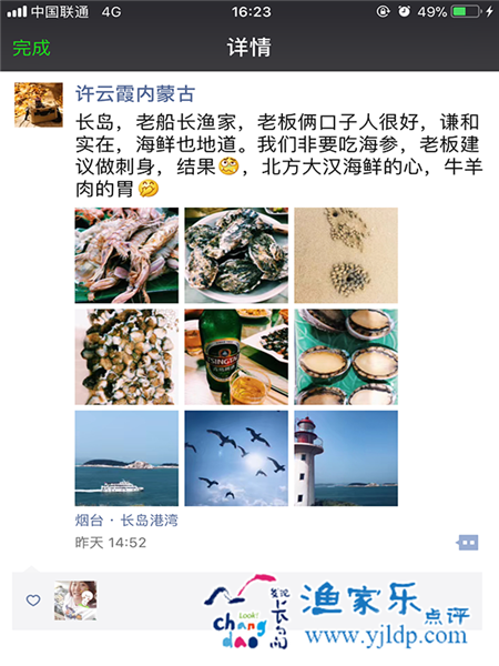 人生中第一次坐船,感覺很特別,站在圍欄內(nèi),海風(fēng)輕輕吹拂,海鷗只只從頭頂飛過,閉上眼,享受片刻美好時(shí)光。決定去長島的時(shí)候,家人們有一定的擔(dān)心,一個(gè)四面環(huán)海,與外界需要船只往來的小島,值得去嗎?結(jié)果,大家個(gè)個(gè)都是滿意而歸。首先入住的漁家,環(huán)境清新雅致,處處都是小用心,床單被子都超級干凈舒適,衛(wèi)浴也很完善,與酒店無異。因?yàn)闈O家是吃住在一起,省去了我們外出吃飯的麻煩,超級貼心。飯菜的味道也美味的不得了。每餐都是不一樣的感覺,頓頓海鮮不重復(fù),絕對的新鮮食材,爭相逃跑的螃蟹個(gè)個(gè)被抓了回來,哈哈,太有意思了,活得鮑魚也開始逃生,一點(diǎn)點(diǎn)蠕動(dòng)的身軀,竟然也能翻越高高的盆沿逃掉。小林相當(dāng)有耐心,一點(diǎn)點(diǎn)把長島的風(fēng)土人情,景區(qū)地貌給我們介紹了一遍,方便我們選擇去哪里玩。時(shí)間真的過的很快,轉(zhuǎn)眼我們回家也有幾天了,一直對那個(gè)小海島念念不忘,對老船長漁家,小林和他對象倍感親切。全家人都說,以后如果有機(jī)會,一家人一定再去長島走一遍,真心滿意,為大家推薦!