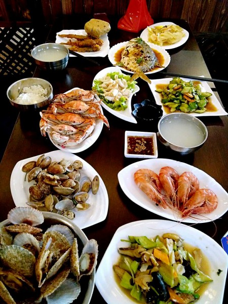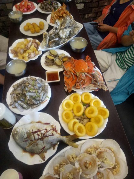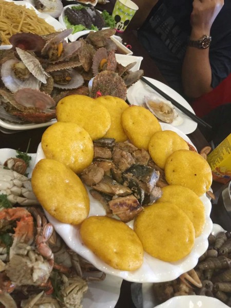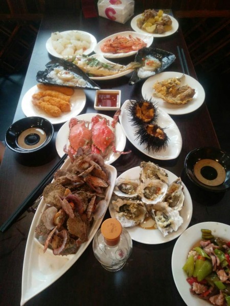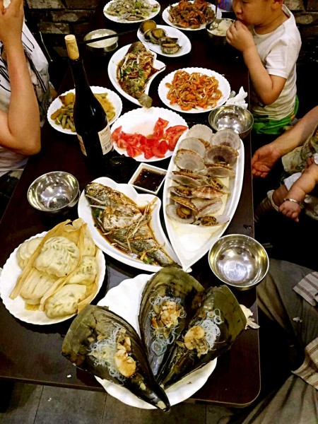 從碼頭十幾分鐘就來(lái)到了位于花溝的興隆漁家,一進(jìn)門(mén),飯已擺上桌,各種魚(yú),各種貝,孩子們這個(gè)喜歡哪,無(wú)以言表。小趙一看就是典型的山東人,高大、憨實(shí),不停地問(wèn)我們吃得慣吃不慣,要不要加其他飯食,總之一句話:就像回到了家!