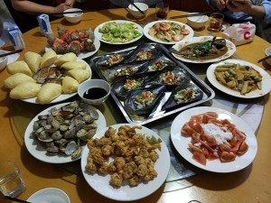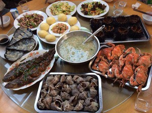再說飯菜。我們哥幾個(gè)人,住了三天,吃了9餐,早餐雞蛋、咸魚、玉米粥,中午晚上都是9、10個(gè)菜,各種生猛海鮮不重樣,給力給力。