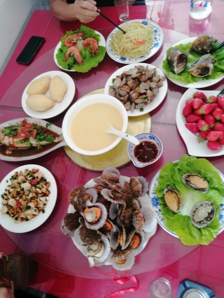 不得不稱贊服務是真好。漁家提供吃住行一條龍服務,服務太細心了。一直指導我們,防騙,省錢小技巧全部接收到。來了長島還接我們?nèi)O家樂,司機也熱情。長島這邊不大,寸土寸金的感覺,房間也挺好,該有的都有了,是一個精致的兩層小農(nóng)家院。這里有豐盛的海鮮大餐,鮑魚大蝦海膽螃蟹貝類每頓都不一樣,鲅魚水餃味道也合我們口味。還有宜人的美景,附近就是景區(qū),走去月牙灣6分鐘,九丈崖看日落特別漂亮,流連忘返。吃完飯,去海邊吹吹海風,那感覺真的是特別的美好。二樓有個大廳有麻將桌,都是免費的,喜歡麻將的可以和朋友搓一把。漁家樂有洗衣機,也都是免費使用,設施還是挺全。原本在這里打算住兩天,但是孩子不舍得離開,我們又多住了一天,挺不錯的旅游地點,我們玩的很開心。值得推薦給朋友!感謝漁家老板一家這幾天的熱情招待,非常完美長島之行。