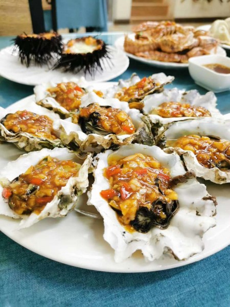 2、就餐:包餐,每天一早兩正,早餐:熱粥、主食南瓜大饅頭,油餅,蛋炒飯,4小涼菜,清爽下飯。中餐晚餐是重點:海菜包子、鲅魚餃子太鮮啦,回家還念念不忘,鮑魚、生蠔、海參、扇貝、海虹、海膽、海螺、海魚、江瑤貝刺身,蝦爬子,頓頓不重樣,量足新鮮,最難得的是這個季節(jié)的蝦爬子,一肚子籽啊,越嚼越香;江瑤貝刺身沾上芥末,那叫一個鮮美,舌頭都快吞掉了;還有海魚,男主介紹說都是自己出海釣的;海膽是第一回品嘗,也是美味,一點都不腥,女主的手藝這里要大大的夸贊一下,麻麻利利,干干凈凈的,藝如其人。